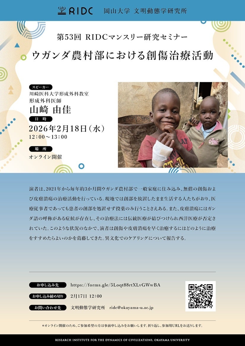 岡山大学文明動態学研究所(RIDC)は2026年2月18日(水)12:00~13:00、第53回RIDCマンスリー研究セミナー「ウガンダ農村部における創傷治療活動」をZoomでオンライン開催します。参加費は無料で、誰でも参加できます。