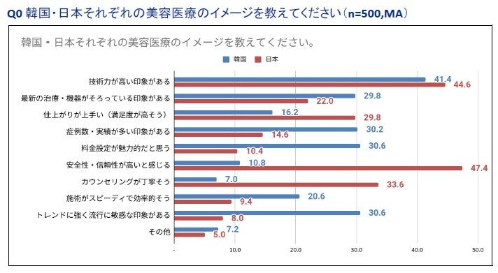 日韓比較では、韓国の美容医療は「料金設定が魅力的」「トレンドに強い」が各30.6%でした。クリニック選定理由は日本が「安全性・アフターケア」61.4%、「言葉の安心感」60.8%で、韓国は「価格の安さ」64.0%が最多となり、重視点の違いが数値で示されました。