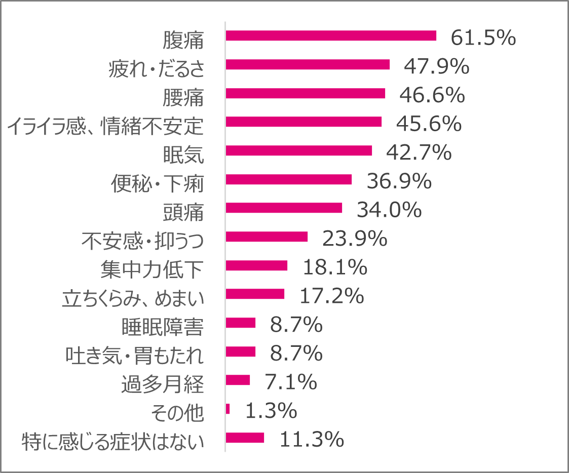 月経に伴う主な症状は腹痛62%、腰痛48%、頭痛34%でした。一方、痛み止めの頓服を使う人は51%いるものの、症状軽減のための日常的なケアを行っていない人は72%に上りました。