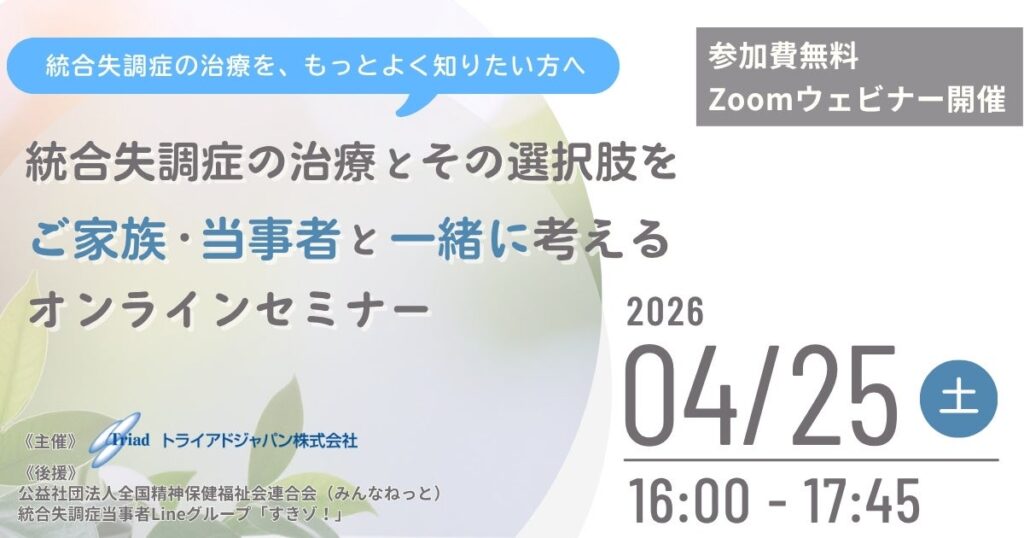 トライアドジャパンは2026年4月25日16時から、統合失調症の治療と選択肢を当事者・家族と共に考えるオンラインセミナーをZoomウェビナーで開きます。定員は300名で参加費は無料、申込締切は4月23日12時です。