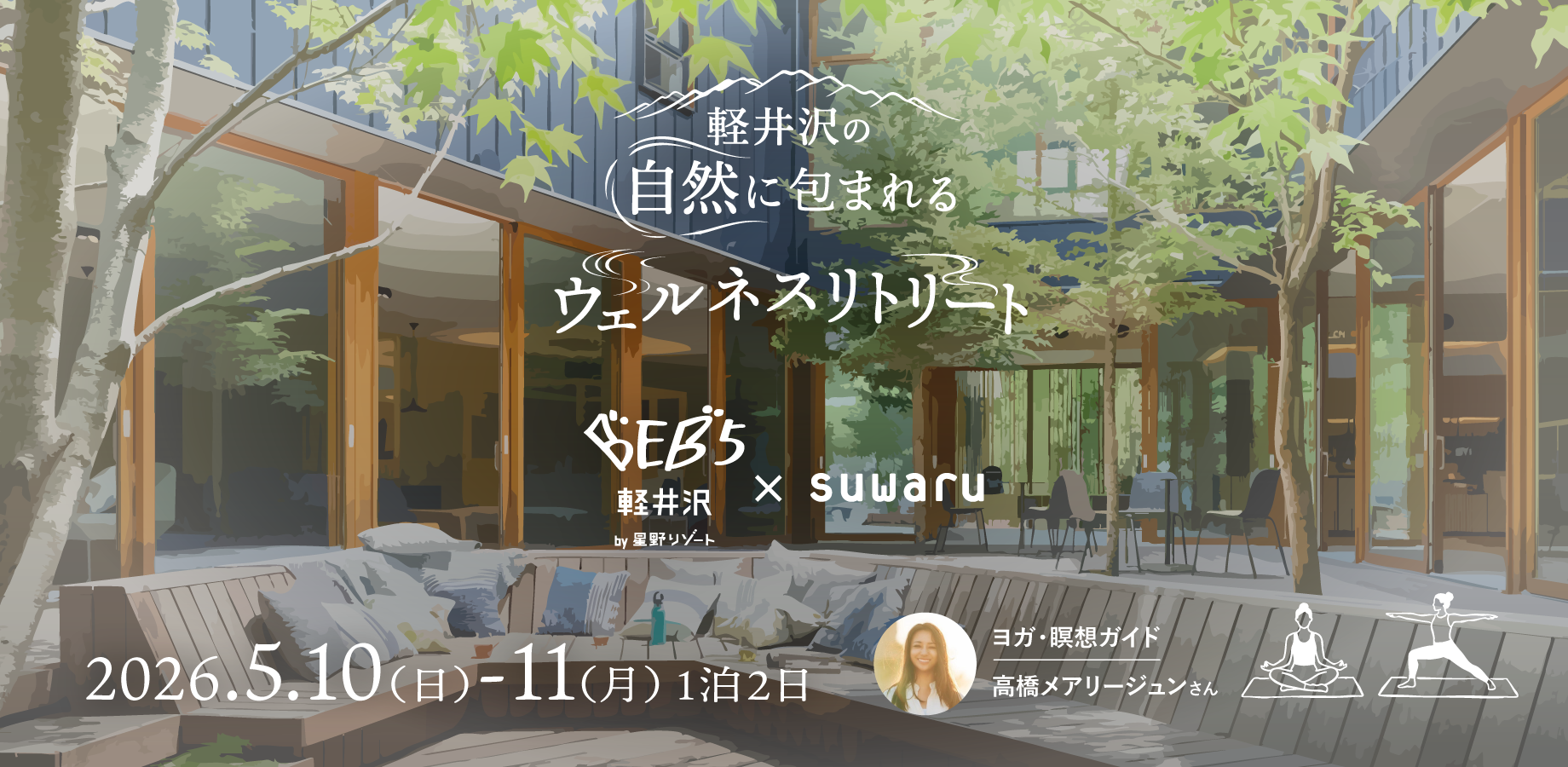 BEB5軽井沢 by 星野リゾートとsuwaru(スワル)は、軽井沢星野エリアで1泊2日のウェルネスリトリートを開きます。日程は2026年5月10日13時集合、11日11時解散です。定員は女性22人で、最少催行人数は20人、参加費は8万3000円(税込)です。
