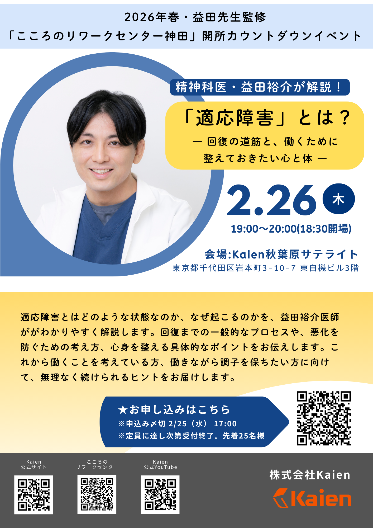 株式会社Kaienは、2026年2月26日19:00~20:00(18:30開場)に、精神科医の益田裕介氏が登壇する特別セミナーを東京都千代田区のKaien秋葉原サテライトで開きます。参加費は無料で、定員は先着25人、申込締切は2月25日17:00です。