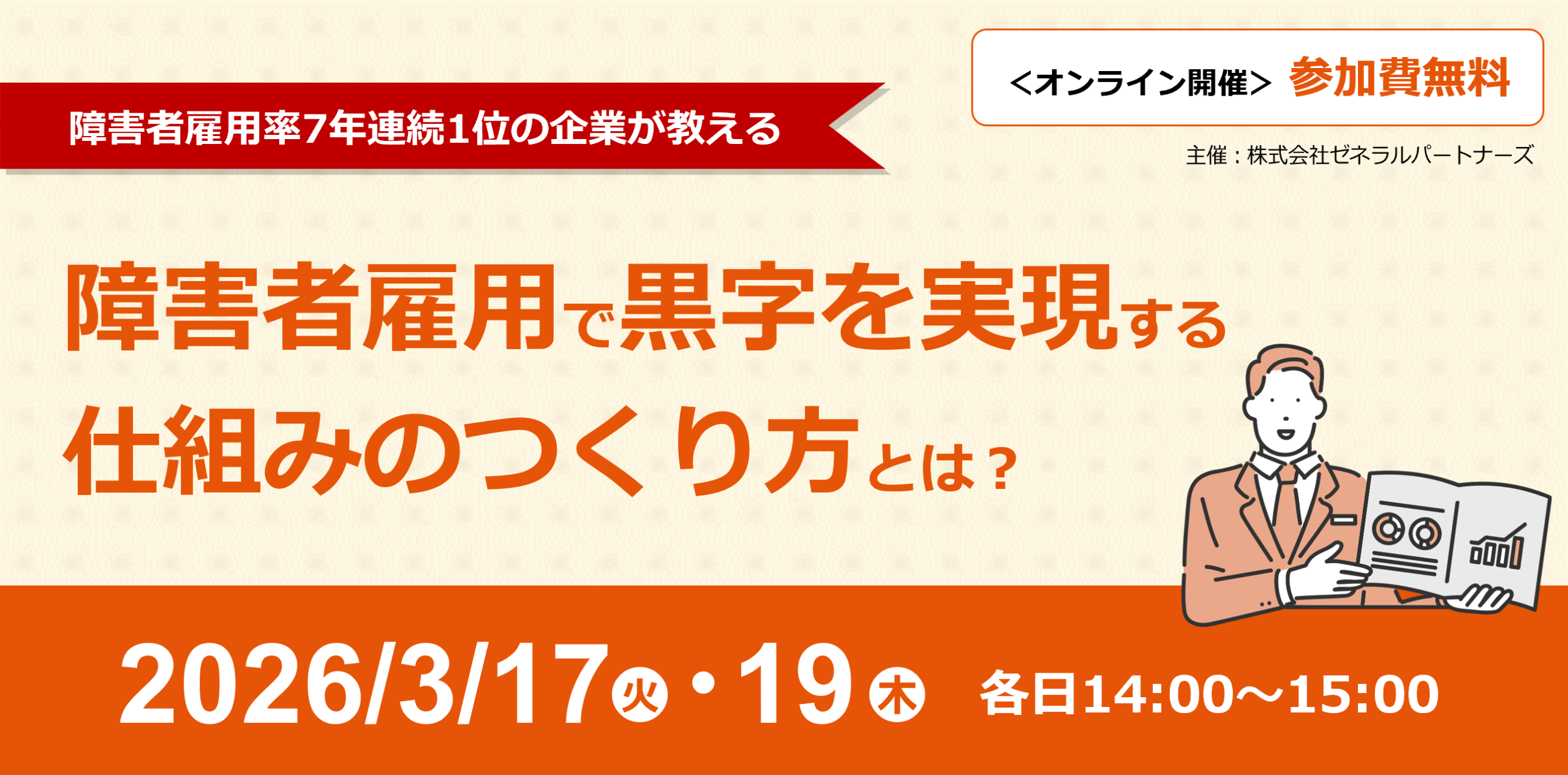 ゼネラルパートナーズ(東京都千代田区)は、障害者雇用の「黒字化」をテーマにした無料オンラインセミナーを2026年3月17日と19日の14時〜15時に開きます。申込締切は各開催日の13時までで、Teamsで実施します。