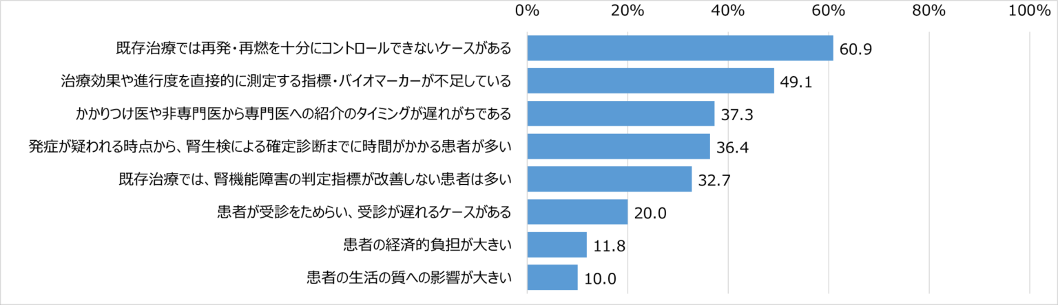 診療患者の年齢は18歳未満5%、18~65歳72%、65歳以上23%でした。主な治療はRAS系阻害薬73%が最多で、SGLT2阻害薬47%、副腎皮質ステロイド薬27%、口蓋扁桃摘出術23%が続きました。医師の不満・懸念は「再燃/再発の制御困難」「定量指標・バイオマーカー不足」「専門医への紹介遅延」が中心で、評価指標不足や紹介遅れが診断・治療開始の遅れにつながる可能性が示されています。