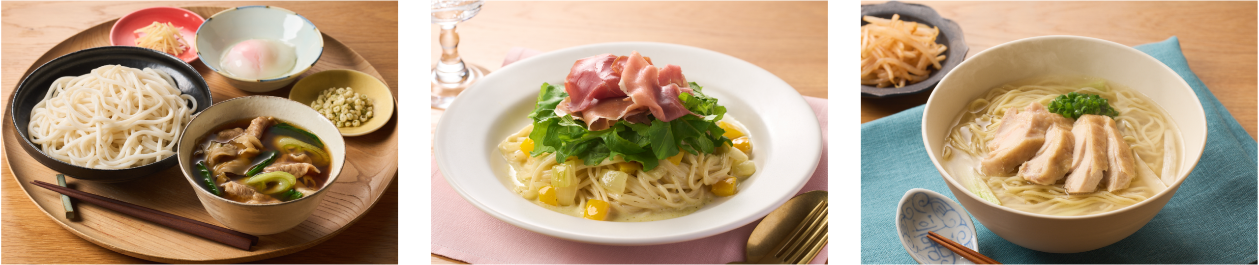 新麺には、日清製粉が開発した高食物繊維小麦粉「アミュリア」を使用します。アミュリアは小麦粉100gあたり約17gの食物繊維を含み、一般的な小麦粉の約5倍で、その約8割が腸内細菌のエサになりやすい「発酵性食物繊維」です。腸内環境研究を行うメタジェンが全メニューを監修し、1食1人前あたり10g以上、かつ8種類以上の食物繊維・オリゴ糖を含む設計としています。