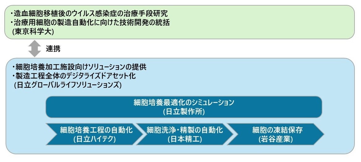 開発では東京科学大学が技術開発をリードし、臨床現場の知見を基礎研究に反映するリバース・トランスレーショナル・リサーチで全体を統括します。日立GLSは細胞培養加工施設向けの空調エンジニアリング技術・ソリューション提供と、稼働データの収集・活用(デジタライズドアセット化)を担い、日立は培養最適化のシミュレーション、日立ハイテクは培養工程の自動化、岩谷産業は凍結保存手順、日本精工は洗浄・精製工程の自動化機器をそれぞれ開発します。