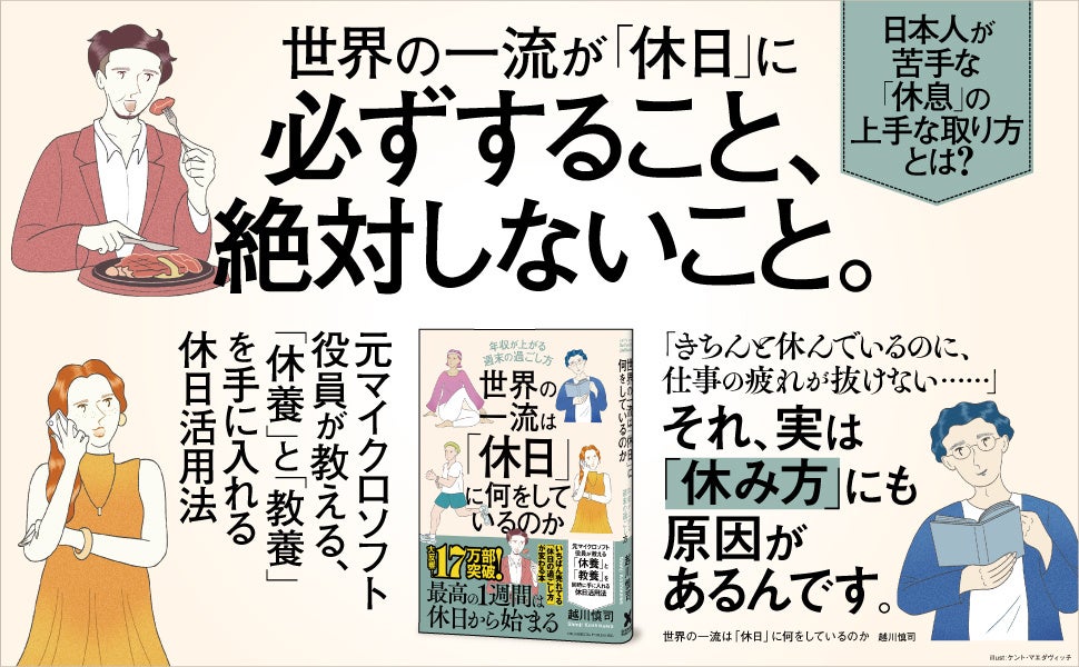 クロスメディア・パブリッシング刊『世界の一流は「休日」に何をしているのか』(越川慎司)が、紙・電子合算で累計20万部を突破し、2025年の「単行本ビジネス書ベストセラー」年間8位(集計期間2024年11月20日~2025年11月18日、日販・トーハン調べ)に入った。12月22日に第15刷の重版も決まった。日本人の78.5%が「疲れている」と答える一方、有給休暇取得率は56.6%にとどまる(日本リカバリー協会調査)など、休めない実態が背景にある。著者は米マイクロソフトでの経験を踏まえ、休日を「エネルギーを再充電する時間」と捉える考え方を提示。休日と仕事の分離やデジタルデトックスなど、5つの使い方を具体例とともに解説する。働き方の見直し機運が続くなか、休息の取り方をテーマにした実用書の動向が注目される。