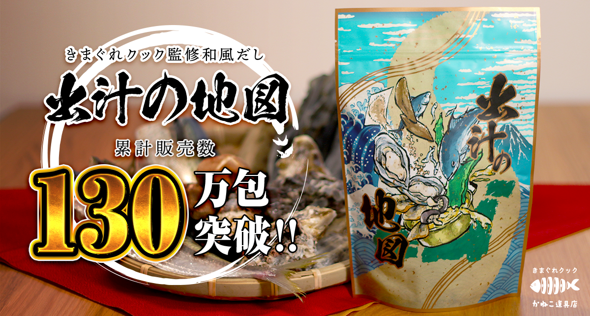 魚捌き系YouTuber「きまぐれクック」が監修する出汁パック「出汁の地図」が、2025年12月時点で累計出荷130万包(30包入り換算)に達しました。販売はCarry On関係の集計で、発売は2023年7月です。