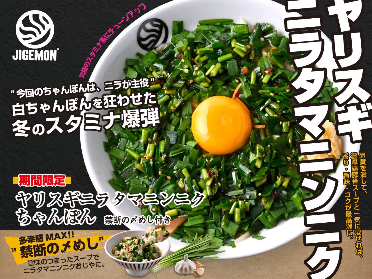 『元祖東京濃厚鶏豚骨 じげもんちゃんぽん』は2026年1月2日〜3月31日、都内5店舗で冬季限定メニュー「ヤリスギニラタマニンニクちゃんぽん(禁断の〆めし付き)」を販売します。価格は並1,408円、小1,353円(税込)です。