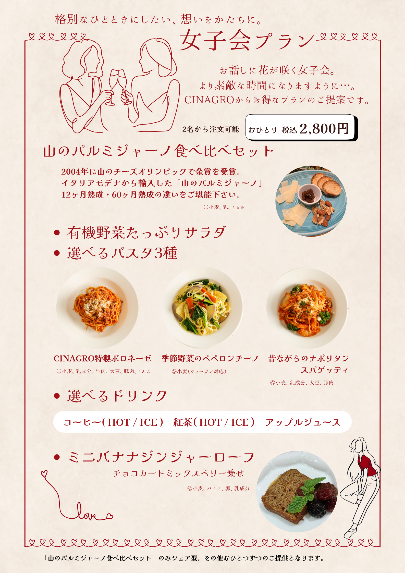 内容はフルコース構成で、前菜セット、サラダ、選べるパスタ、選べるドリンク、デザートを組み合わせます。パスタは3種(CINAGRO特製ボロネーゼ、季節野菜のペペロンチーノ、昔ながらのナポリタンスパゲッティ)から選べ、ドリンクはコーヒー・紅茶・アップルジュースを用意します。