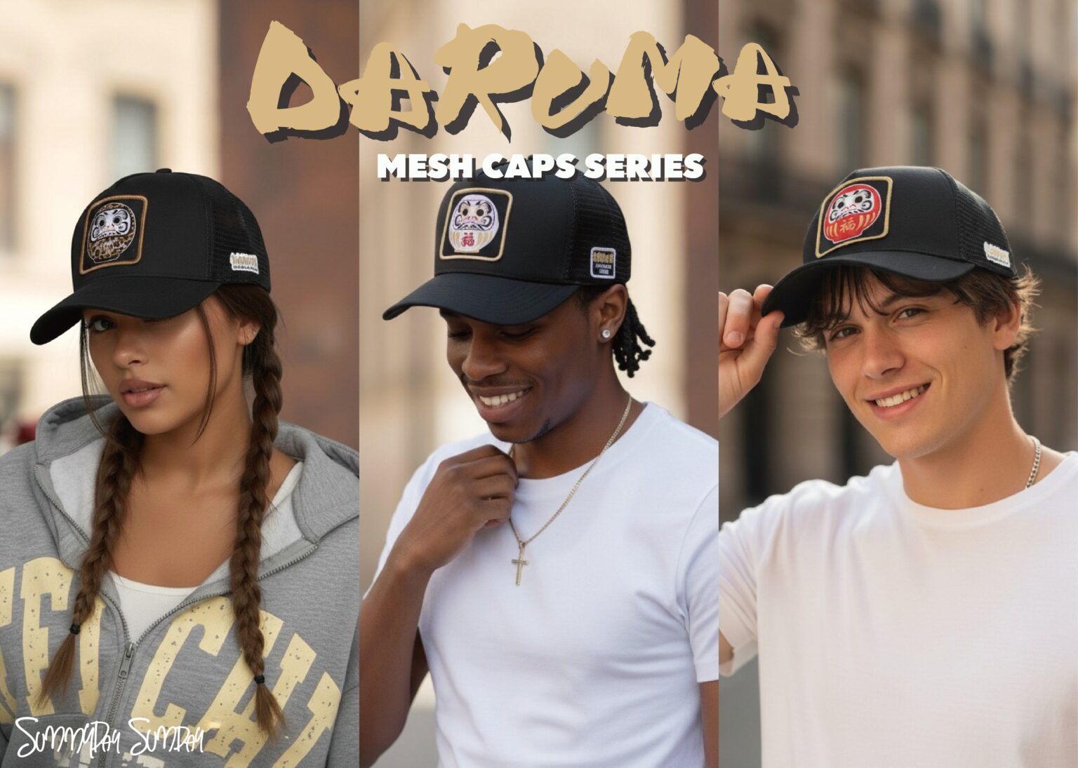 フロントにだるまグラフィックを大きく配し、通気性に優れたメッシュ素材を採用します。カラーは赤だるま、白だるま、レオパード柄だるまの3種類で、日常使いに加え、アウトドアやフェスなどアクティブな場面での着用も想定しています。