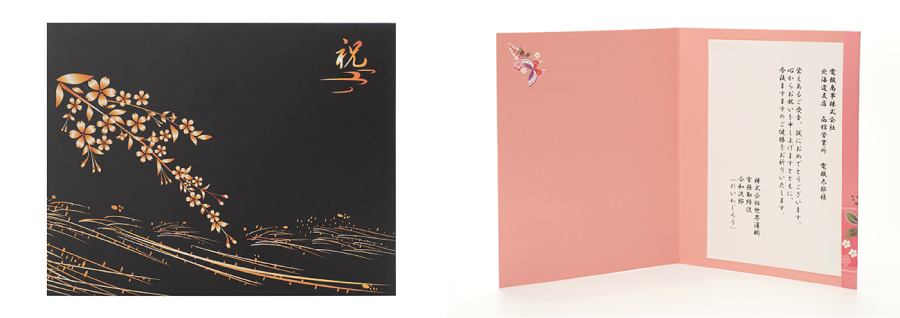 追加された慶事台紙は、黒基調の和柄で格式を意識した「雅」、ピンク基調で桃やスズラン、蝶を配した「花舞」、金基調の華やかな「宝祝」。弔事台紙は、草花と水の流れをイメージしたグレー基調の「清」と、藍色に牡丹をあしらった「恩」です。サイズはいずれも縦17.8cm×横23.0cm。法人の取引先行事や弔意連絡など、用途別の選択肢を広げた形です。