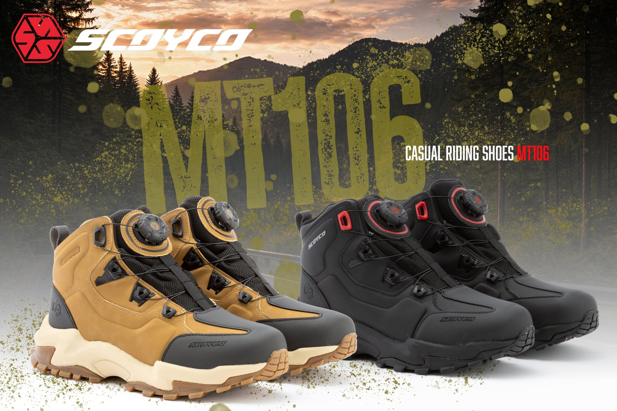MT106はトレッキングシューズ風デザインを採用し、日常の移動から林道・キャンプなどのアウトドアツーリングまで履き替え不要を狙います。ラグソール(凹凸の大きい靴底)や大型ダイヤル式シューレース、メッシュタンを備え、歩行とライディングの両場面での使い勝手を意識した設計です。