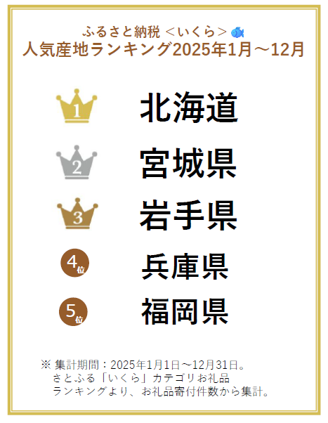 ふるさと納税ポータル「さとふる」は、2025年1~12月の「いくら」お礼品の寄付件数を分析し、人気産地ランキングで北海道がシェア9割以上で1位になったとまとめました。2位は宮城県、3位は岩手県でした。