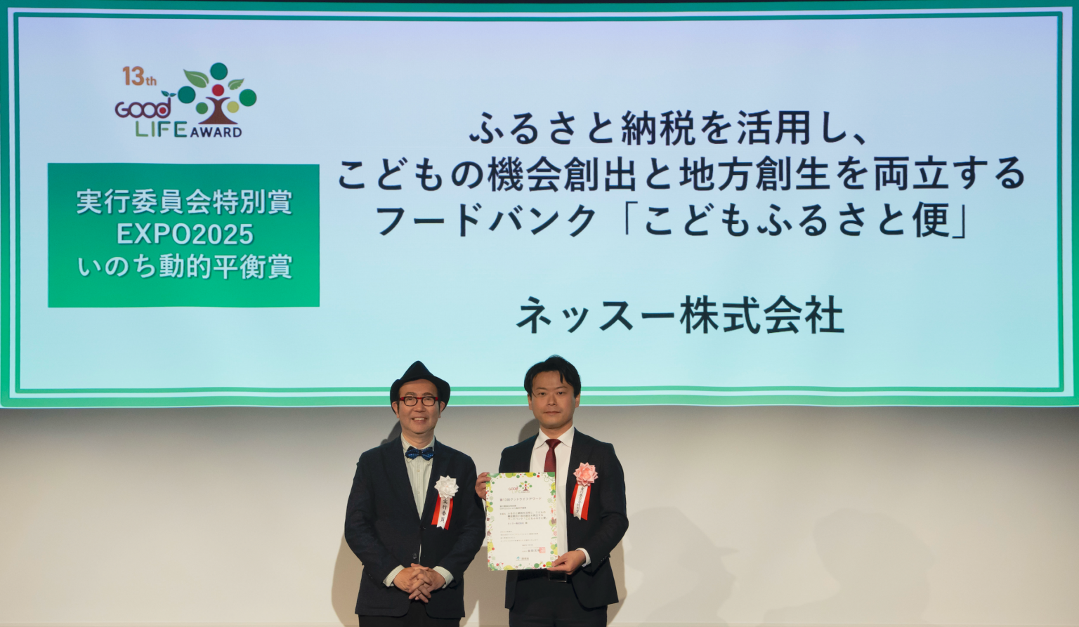こどもの機会格差解消に取り組むネッスー株式会社(東京都世田谷区)の「こどもふるさと便」が、環境省主催「第13回グッドライフアワード」で実行委員会特別賞「EXPO2025 いのち動的平衡賞」を受賞しました。表彰式は2025年12月6日に東京都内で行われ、代表取締役の木戸優起氏が登壇しました。
