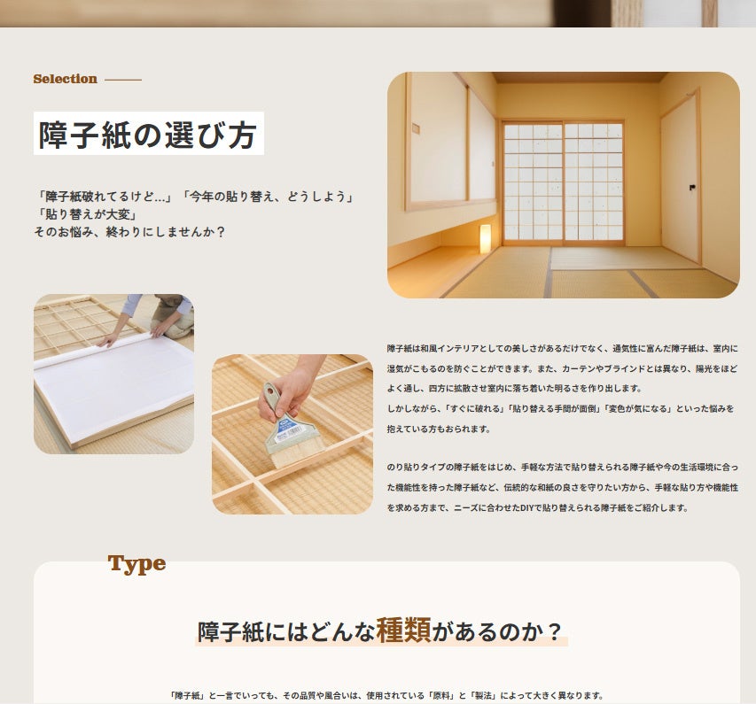 ページでは、冬の寒さ対策や室内の雰囲気づくりに役立つ障子の基礎知識に加え、障子紙の種類と特長、選定ポイント、施工手順を整理。貼り方は、障子のりで貼る「のり貼り」、熱で接着する「アイロン貼り」、専用テープで貼る「両面テープ貼り」の3方式を紹介し、必要な道具も明記しています。専門用語は手順に沿って補足し、初心者から経験者までの疑問に対応するFAQも掲載しました。今後は、年末の住まいメンテナンス需要を背景に、情報ページの活用が広がる可能性があります。