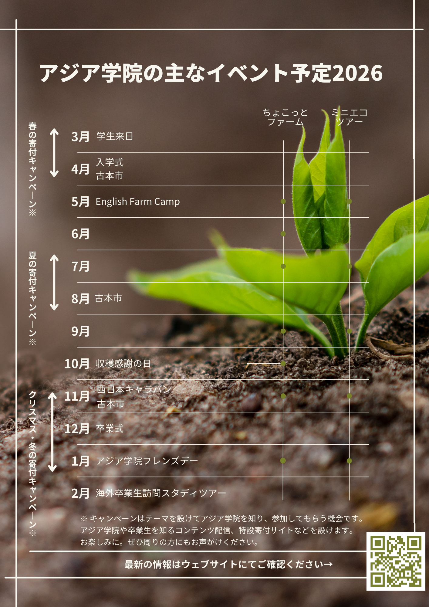 予定される主な行事は、春の学生来日(3月)や入学式、古本市(4月)、English Farm Camp(5月)に加え、夏の古本市(8月)、秋の収穫感謝の日(10月)や古本市、西日本キャラバン(11月)、冬の卒業式(12月)などです。2027年に入ってからも、アジア学院フレンズデー(1月)や海外卒業生訪問スタディツアー(2月)を組み込み、季節ごとに交流の場を設けます。