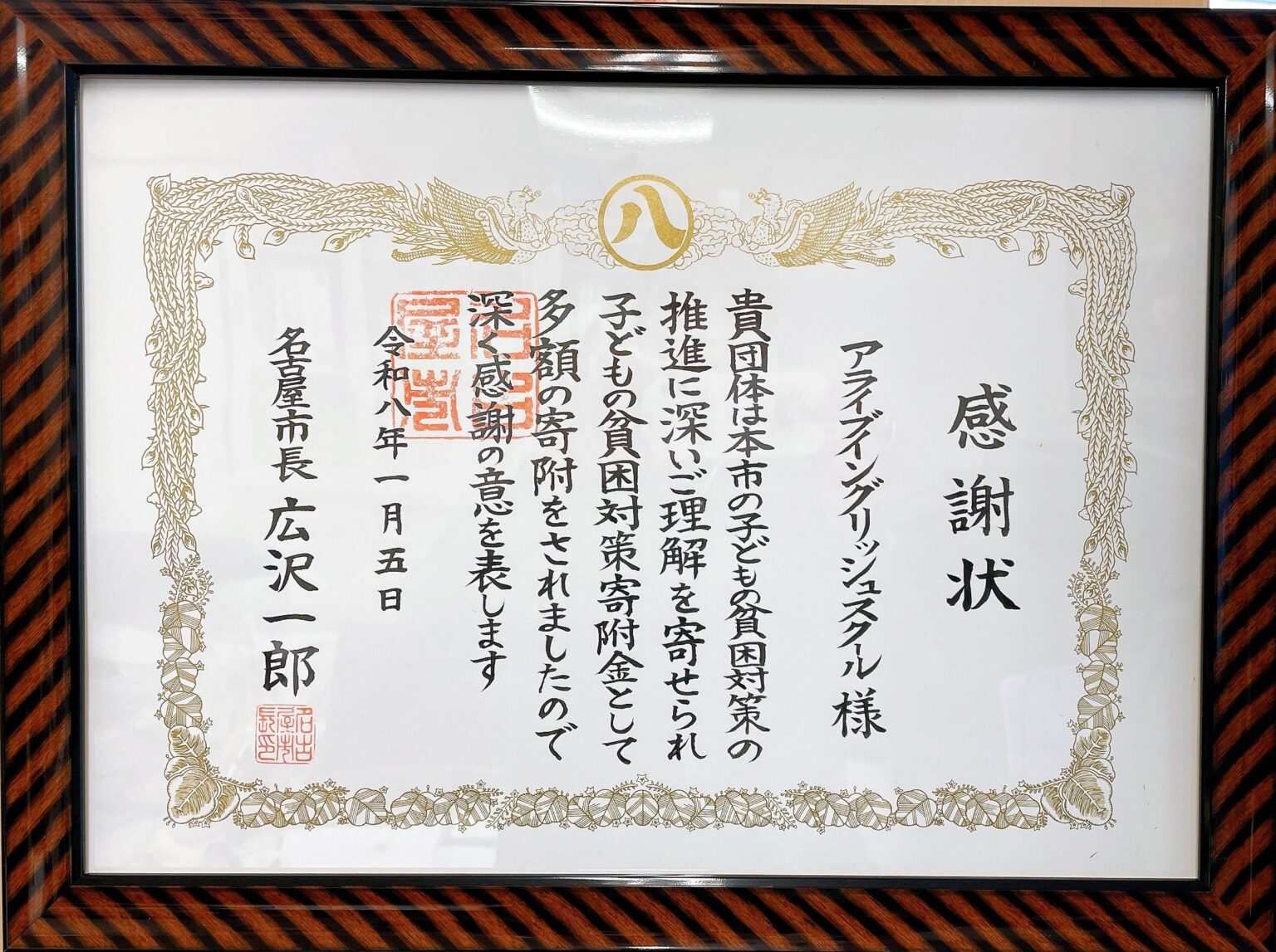 名古屋市内で英語の保育園・英会話スクールなどを運営する株式会社アライブは、2025年秋に開催した「アライブハロウィン・チャリティパーティ」の売上金の50%にあたる23万7,000円を、名古屋市の子ども青少年事業(子ども食堂など)へ寄付した。2026年1月には名古屋市長から表彰状を受けたとして、2月2日19時50分に公表した。