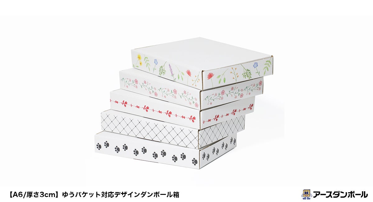 ダンボール梱包材を扱うアースダンボールは、ゆうパケットに対応したA6サイズ・厚さ3cmのデザインダンボール箱5種類を2025年11月12日に発売しました。主力商品「花のフレーム(水彩)」などを含む新シリーズで、自社ECサイトで1箱39円(税込)から購入できます。内寸は158×115×25mm、外寸は165×124×28mm、厚みは1.5mm(E/F)で、重量は35gです。