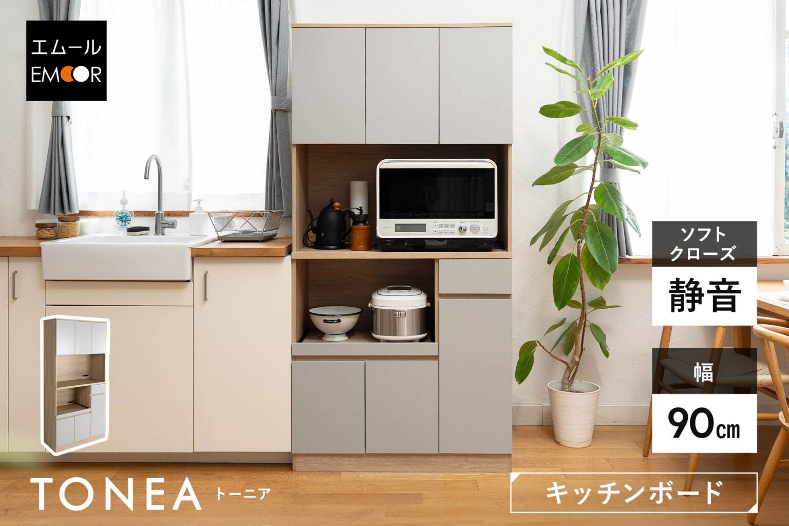 エムール(東京都立川市)は2026年3月10日から、健康家具ブランドEMOORのキッチンボード「TONEA(トーニア)」を販売します。価格は4万5000円(税込)で、サイズは幅90×奥行42×高さ183cm、製品重量は約55kgです。