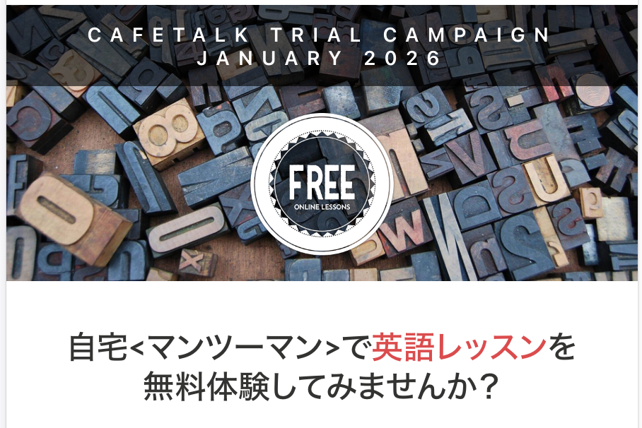 オンライン習い事サイト「カフェトーク」は、オンライン英会話を最大3回無料で受講できる「新春特大モニターキャンペーン」を2026年1月19日から1月31日まで実施します。対象は期間中にキャンペーンページからエントリーした会員で、当選者には3,000ポイント(1ポイント=1円、税別)まで使える無料チケットを2枚付与します。