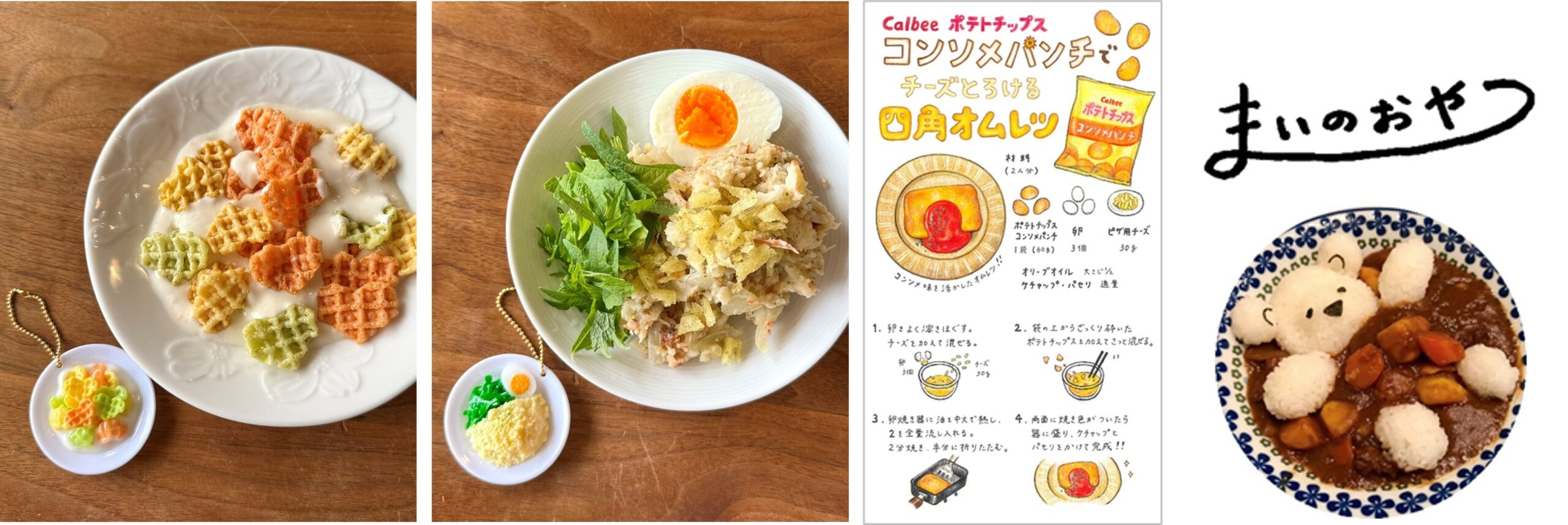 本商品は、カルビーのスマートフォンアプリ「カルビー ルビープログラム」とのコラボ企画の一環です。菓子を使った「アレンジレシピ」(既存商品に材料を足して別メニューにする発想)を、リアルなミニチュアマスコットとして表現し、各種にミニイラストレシピ(レシピ豆本)を付けます。