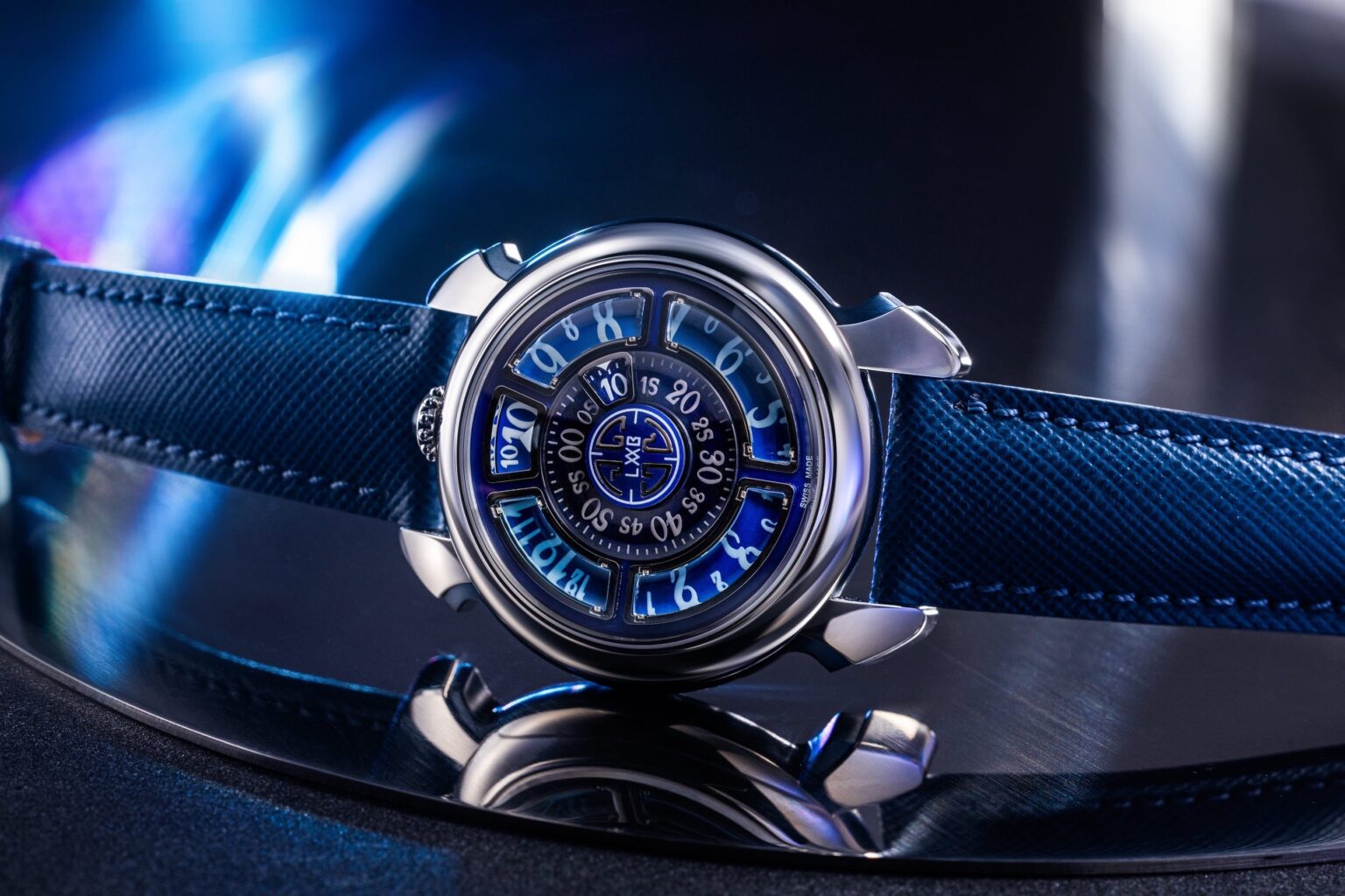 ベースダイヤルにラピスラズリを用い、全インデックスに夜光塗料スーパールミノバを採用。12時位置のディスク式時表示、中央のラピス製分表示、円形スモールセコンドで独自の読み取り体験を提供します。前面は無反射コーティングのドーム型サファイア、背面はシースルーバックで、暗所で発光するローターの動きを鑑賞できます。