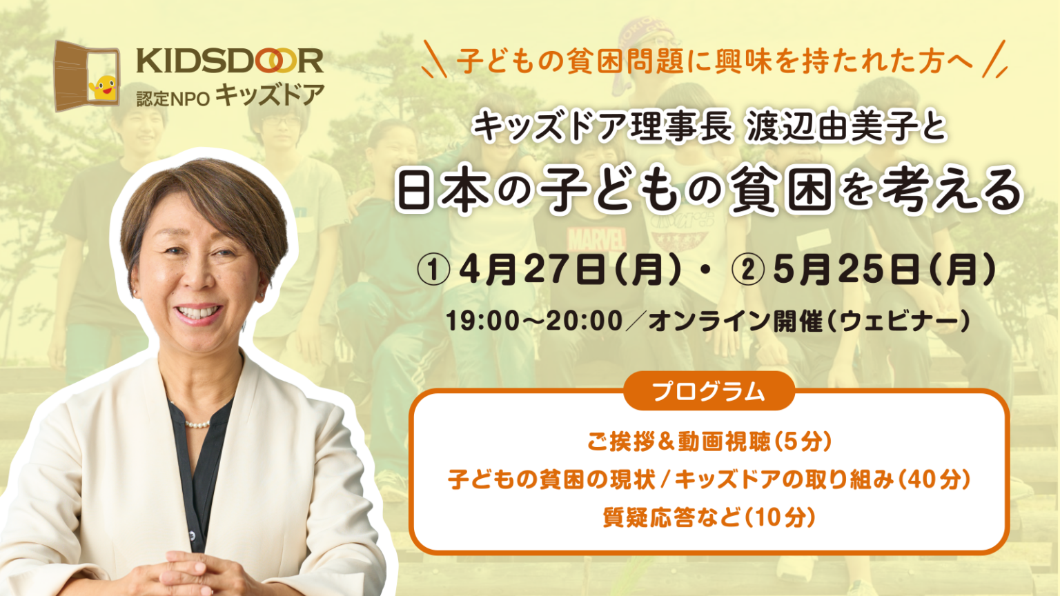 認定NPO法人キッズドア(東京都中央区)は、オンライン勉強会「キッズドア理事長・渡辺由美子と日本の子どもの貧困を考える」を2026年4月27日と5月25日の各19時〜20時に開きます。参加費は無料で、Zoomで実施予定です。