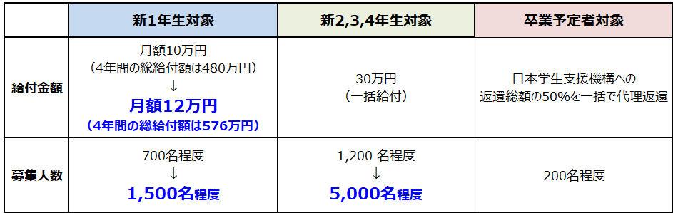 公益財団法人キーエンス財団(大阪市)は2026年1月5日、奨学金支援を拡充すると明らかにしました。2026年4月に大学へ進学する新1年生向けの「給付型奨学金」は、給付額を従来の月額10万円から月額12万円へ増額し、採用人数も700人から1,500人へ大幅に広げます。支援は卒業までの4年間です。応募受付は2026年2月2日に始まる予定です。対象は4年制の学部・学科に在籍(または入学予定)の学生で、文系・理系を問わず、所得制限も設けないとしています。あわせて、新2~4年生を対象とする「応援給付金」も募集枠を拡大し、採用人数を前年度の3,500人から5,000人へ増やします。同制度も応募開始は2月2日の予定です。なお、2026年3月卒業予定の大学4年生を対象とした「貸与奨学金の返還支援」は今年度の募集を終了しており、来年度は2027年3月卒業予定者(現在の大学3年生)向けに募集を行う見通しです。詳細は2026年6月ごろに同財団サイトで公表するとしています。今後は応募開始に向け、各制度の要件や選考方法の周知が進むとみられます。