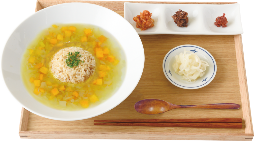 新メニューは、植物がつくる成分「ファイトケミカル」を摂りやすいスープをベースに、有機玄米を組み合わせた構成です。味はプレーン・みそ味・しょうゆ味から選べ、玄米の増量は追加料金で対応します。