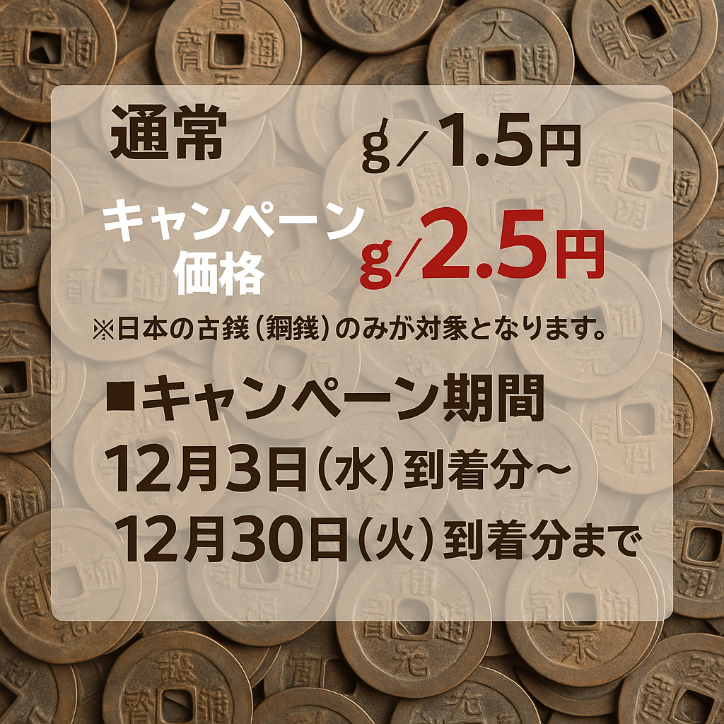 東京都豊島区に本社を置く株式会社クロスワンは、リユース事業部で古銭(銅銭)の買取価格を通常の1gあたり1.5円から1gあたり2.5円へと約67%引き上げるキャンペーンを実施しています。対象は日本の銅製古銭のみで、寛永通宝など広く出回った銅銭も含まれます。