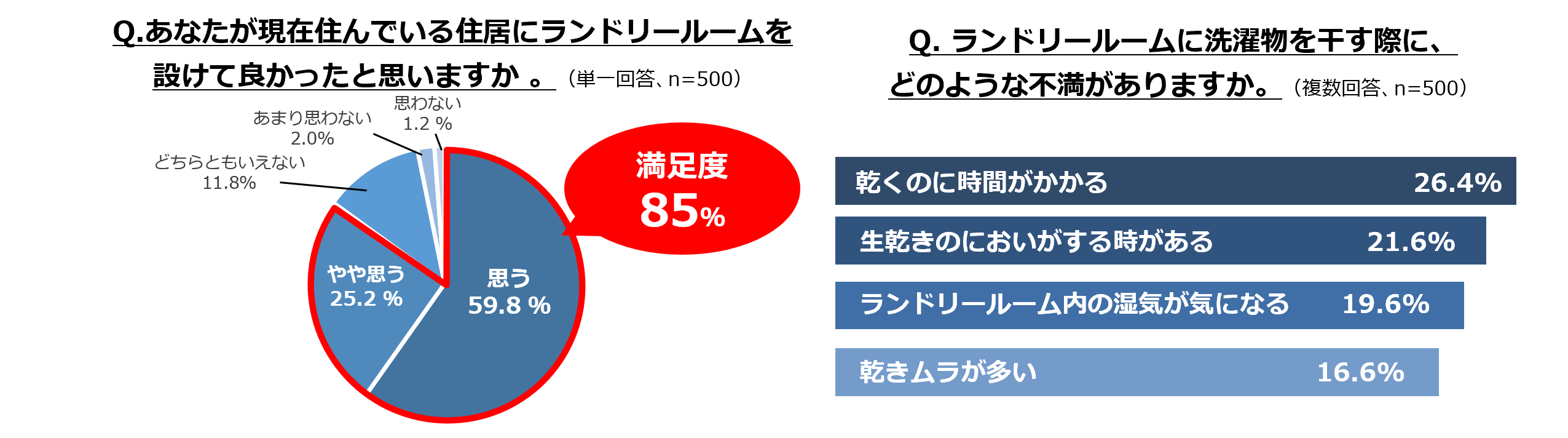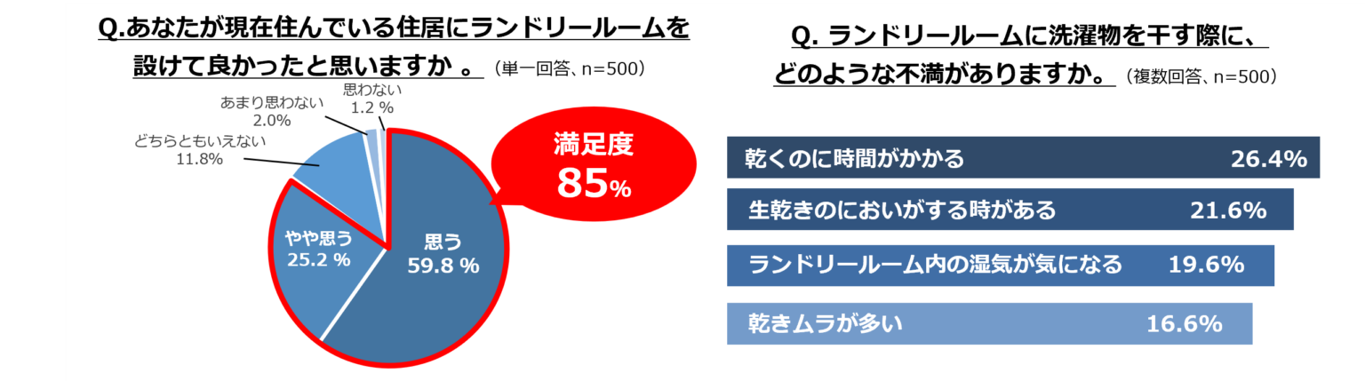 調査では、ランドリールーム所有者のうち共働き子育て世帯が38.8%を占め、設置してよかったは85.0%でした。一方で不満も残り、洗濯物が乾くのに時間がかかるが26.4%、生乾きのにおいがする時があるが21.6%でした。