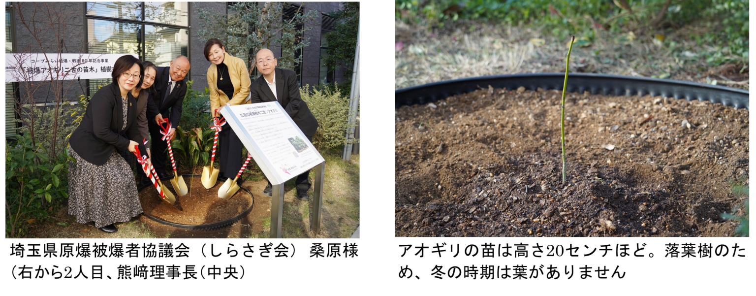 生活協同組合コープみらい(本部・埼玉県さいたま市南区)は、被爆・戦後80年を迎えた節目に合わせて、2025年12月5日(金)13時30分から本部敷地内(さいたま市南区根岸1-5-5)で「被爆アオギリ二世」の苗木1本を植樹しました。当日は代表理事理事長の熊﨑伸氏や理事、埼玉県原爆被爆者協議会(しらさぎ会)の桑原慶子氏らが出席し、約20分間の植樹式が行われました。
