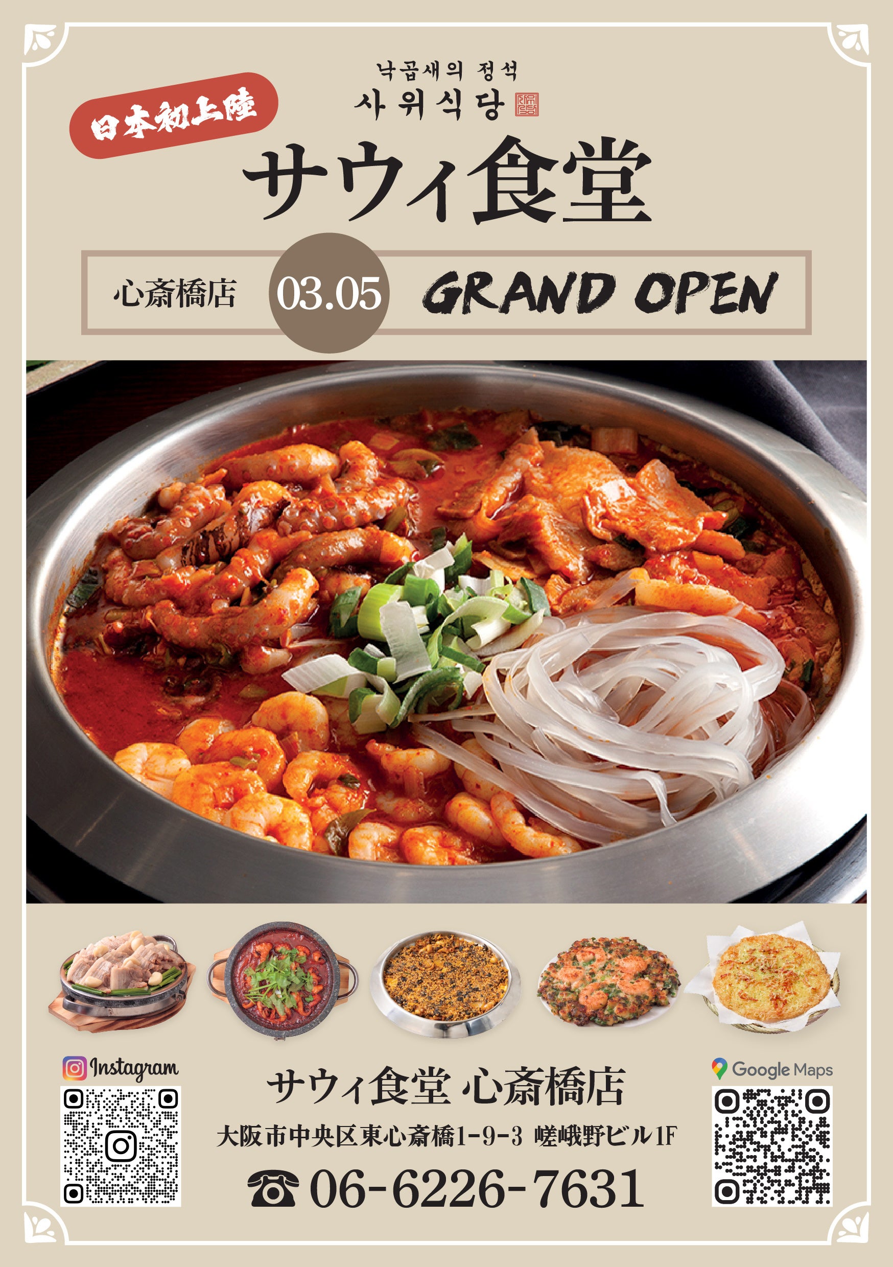 ナッコプセ専門店「사위식당(サウィ食堂)」は、2026年3月5日(木)に大阪・東心斎橋で心斎橋店をオープンします。所在地は大阪府大阪市中央区東心斎橋1-9-3 嵯峨野ビル1Fで、営業時間は11:00〜23:00、電話番号は06-6226-7631です。堺筋線の長堀橋駅から徒歩2分、御堂筋線の心斎橋駅から徒歩7分圏内に立地します。