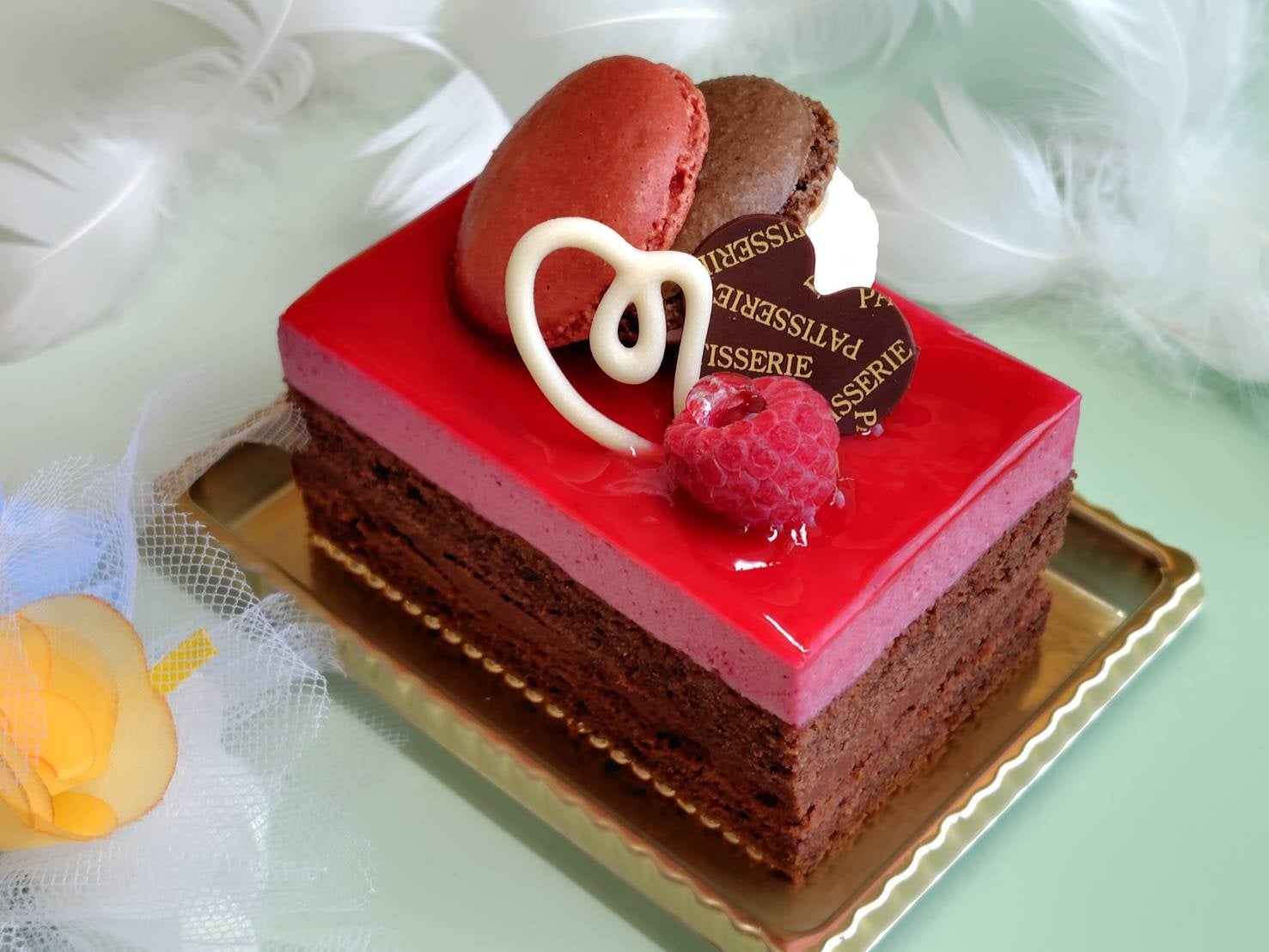 商品は、フランボワーズ(木いちご)のムースとクーベルチュール(製菓用に品質基準を満たしたチョコレート)ガナッシュを重ねたショコラデザートで、店頭ショーケースでの販売に加え、予約も受け付けます。本体サイズはタテ約5.3cm×ヨコ約8.3cm×高さ約4.5cm(デコレーション部分除く)です。