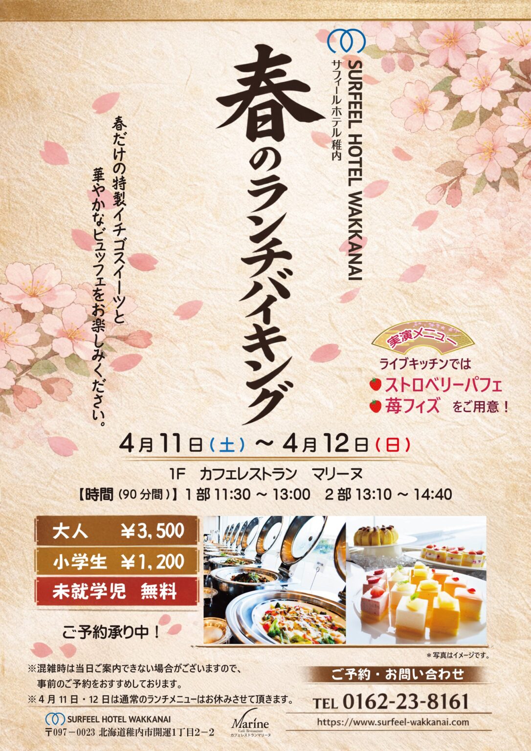 サフィールホテル稚内(北海道稚内市)は4月11日と12日の2日間、1階「カフェレストラン マリーヌ」で「春のランチバイキング」を実施します。各回90分の食べ放題で、1部は11:30〜13:00、2部は13:10〜14:40の入替制です。料金は大人3,500円(税込)、小学生1,200円(税込)、未就学児は無料です。