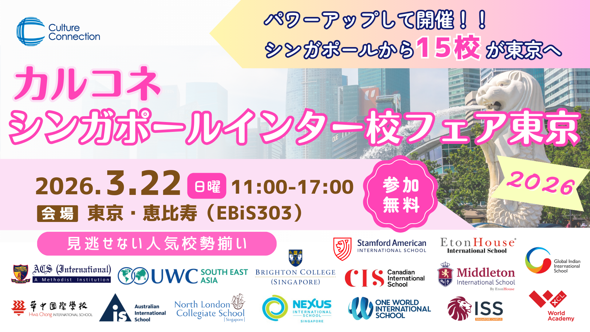 主催はシンガポールの教育コンサルティング会社Culture Connection Pte Ltd(カルコネ)。当日は11:00〜12:40、13:00〜15:00、15:00〜17:00の3部制で、申込時に参加枠を選びます。各校ブースでの個別相談は基本2家族までとして混雑を抑える設計です。