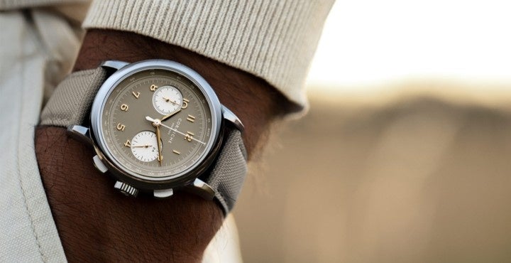 本モデルは、2021年に即完売した「Vert Militaire」に続くミリタリーシリーズ第2弾で、サンドベージュの文字盤とローズゴールドカラーの組み合わせが特徴です。ケース素材には316Lステンレススチールを採用し、厚み12mmのケースにポリッシュとサテン仕上げを織り交ぜることで立体感を強調しています。文字盤はセラミック製で、砂地を思わせるサンドベージュにアラビア数字のインデックスとレイルウェイトラック(線路のような目盛り)を配し、視認性と装飾性を両立しています。ホワイトのサブダイヤルと外周のタキメータースケールが、クラシックなスポーツクロノグラフとしての印象を引き締めます。