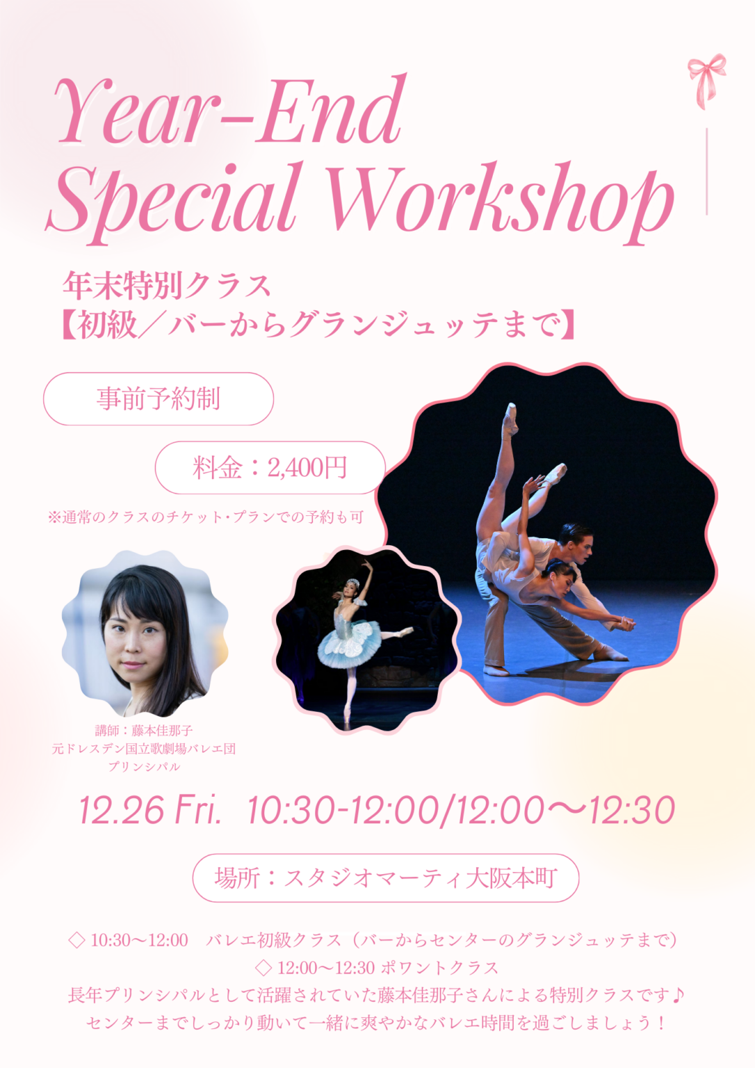 スタジオマーティ大阪本町(大阪市中央区)は12月26日・27日・29日に年末限定の特別バレエクラスを開く。26日は元ドレスデン国立歌劇場バレエ団プリンシパルの藤本佳那子氏がゲスト講師として初級クラス(10:30~12:00)とポワント(つま先で立つ技法、12:00~12:30)を担当し、定員は先着17人。27日は入門~基礎(10:30~12:00)、ポワント(12:00~12:30)、バリエーション(13:00~14:30)などを実施し、バリエーションでは「ラ・バヤデール」影の王国より第1Vaに取り組む。29日は初中級(15:30~17:00)で普段より難度を上げた内容とする。予約は専用サイト「hacomono」から行い、各レッスンは原則として実施3日前の22時から受け付ける。年末の集中受講ニーズを取り込みつつ、ゲスト講師回の満席状況が開催効果を左右しそうだ。