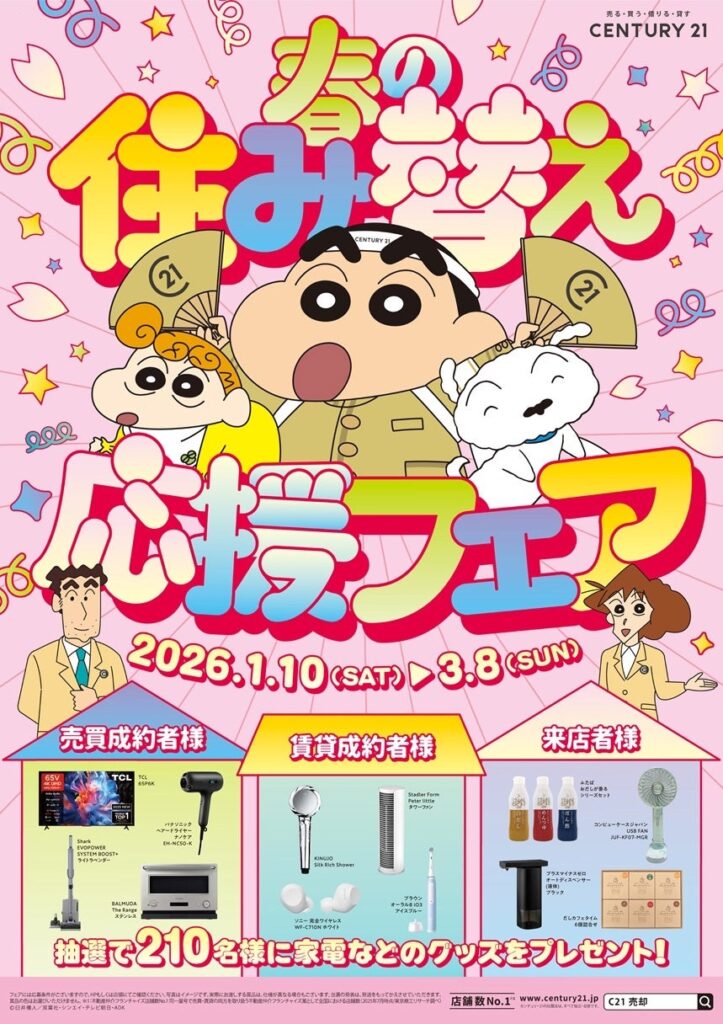 センチュリー21の全国加盟店で、2026年1月10日〜3月8日に「春の住み替え応援フェア」が行われます。期間中の売買・賃貸の成約者や来店相談者を対象に、抽選で計210人へ家電や日用品などが贈られます。
