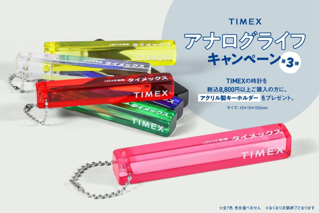アメリカの時計ブランド「TIMEX(タイメックス)」は2026年3月19日から、全国の対象店舗で「アナログライフキャンペーン 第3弾」を始めます。期間中に販売価格8,800円以上(税込)のタイメックス腕時計を1点購入すると、先着でオリジナルのアクリル製キーホルダー(非売品)を1つ受け取れます。