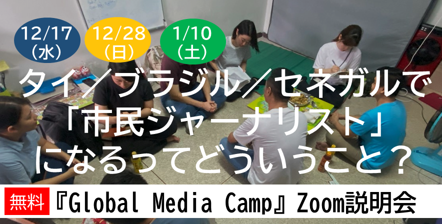タイ、ブラジル、セネガルで市民ジャーナリストとして現地取材に挑むプログラム「Global Media Camp(GMC)」が、2026年2~3月に各地で実施されます。主な対象は18~59歳の社会人と学生で、これまでに世界9カ国13カ所で45回開催、累計参加者は215人です。オンライン無料説明会は2025年12月17日、12月28日、2026年1月10日の3回、Zoomで行われます。