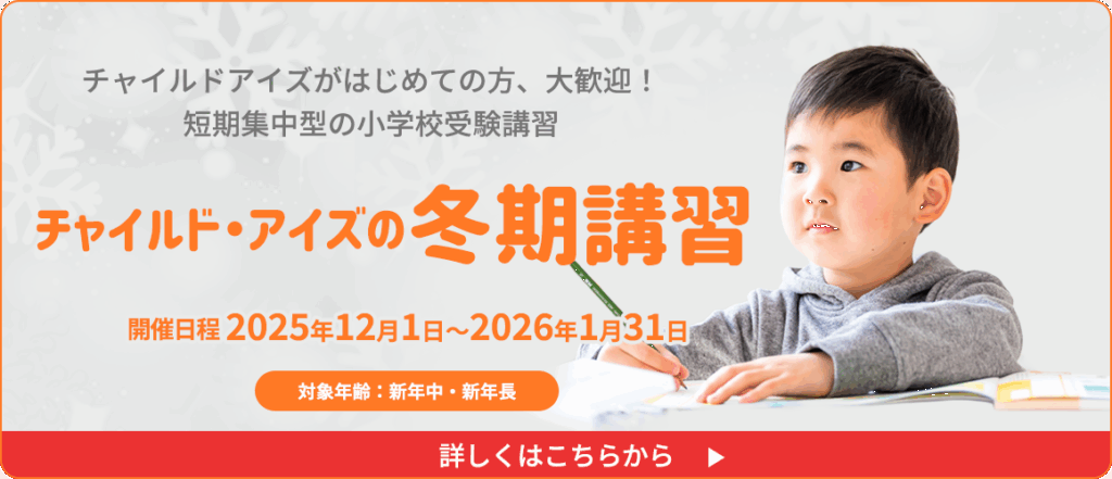 小学校受験では、季節や行事の理解、指示理解、聞く姿勢など非認知的要素も評価対象になります。冬休みは日数が限られる一方でまとまった学習時間を確保しやすく、行事と結びつけた体験学習が知識の定着に有効とされます。チャイルド・アイズは知能育成と幼児心理学に基づく個別最適な指導で到達度に応じた課題設定を行います。