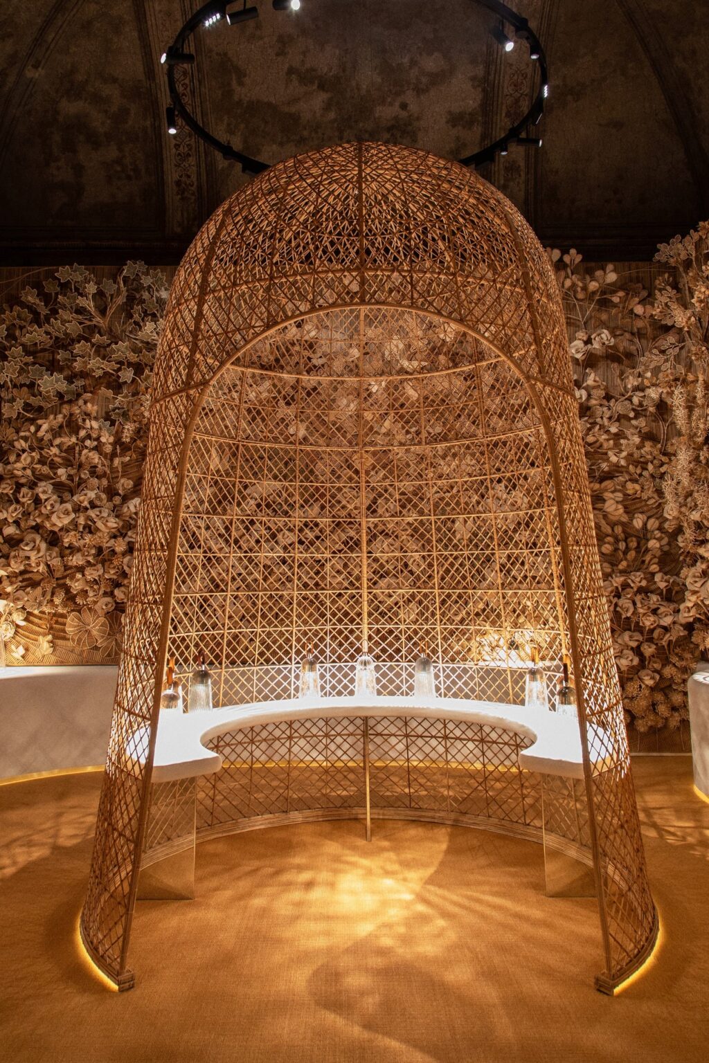 新作は、メゾンを象徴する「コロール」スカートのシルエットに着想し、ディオールのコードである「カナージュ」(格子状モチーフ)を造形に落とし込んだ点が特徴です。素材にはガラスに加え、日本の竹細工技術を用い、職人の手仕事による表現を前面に出しました。
