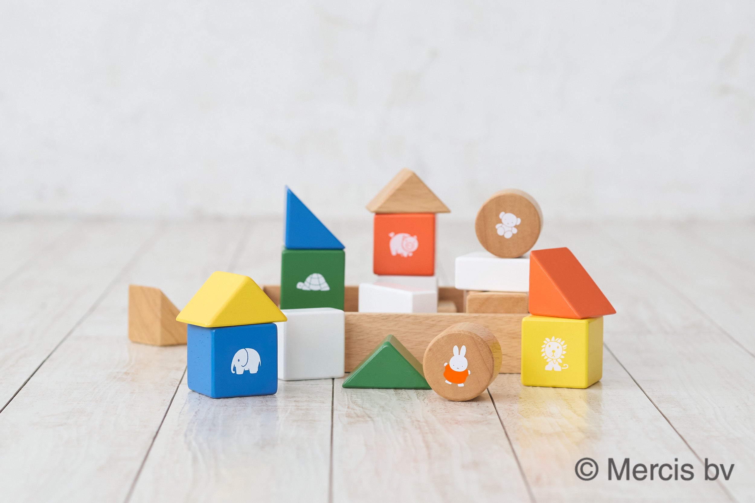 商品は20ピース構成で、おとつみき6、白木つみき6、カラーつみき8をセットにしました。赤・青・緑・黄に白を加えたブルーナカラーのつみきにイラストを施し、振ると「カラカラ」と音が鳴る仕組みです。基尺は45mmで持ちやすさに配慮し、角を丸く加工、専用木箱に収納できます。