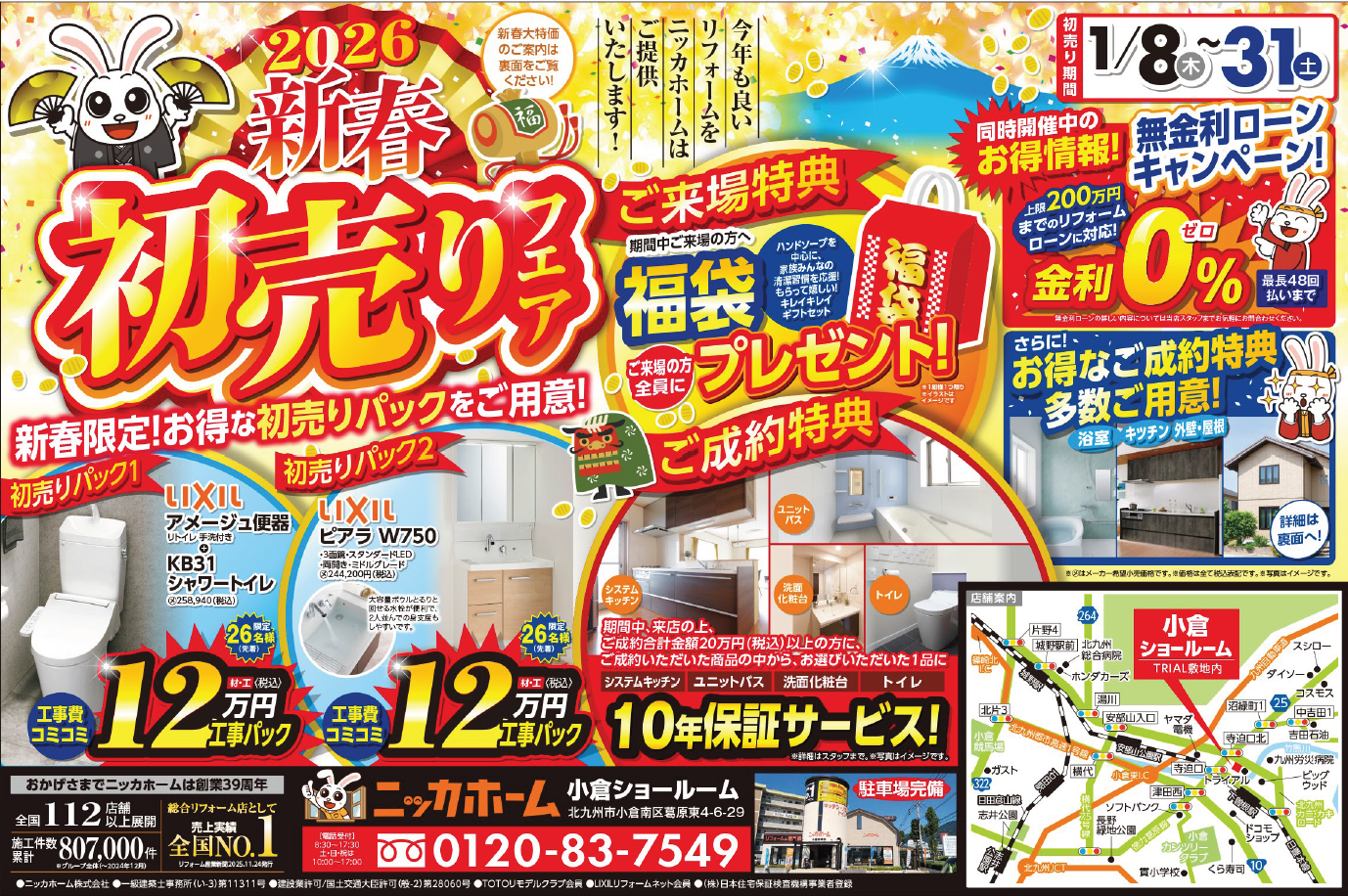 ニッカホームは2026年1月8日から31日まで、福岡県北九州市のニッカホーム小倉ショールームで「新春初売りキャンペーン」を実施します。創業39周年に合わせた企画で、期間中は商品を新春特価で提供し、見積もり依頼者に「キレイキレイ福袋セット」を進呈します。