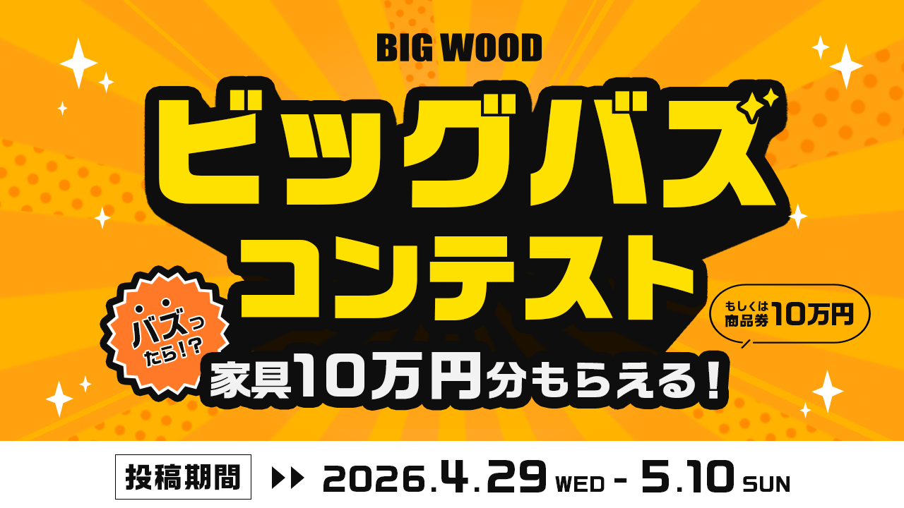 ビッグウッド兵庫のフランチャイズ運営を担うブライダル・ボックス(兵庫県明石市)は、来店者が店内で撮影した動画をTikTokまたはInstagramリールに投稿し再生回数を競う参加型企画「ビッグウッド ビッグバズコンテスト」を、2026年4月29日〜5月10日に兵庫県内5店舗で実施します。最多視聴の「ビッグバズ賞」は1名で、家具または商品券10万円分(上限)を進呈します。