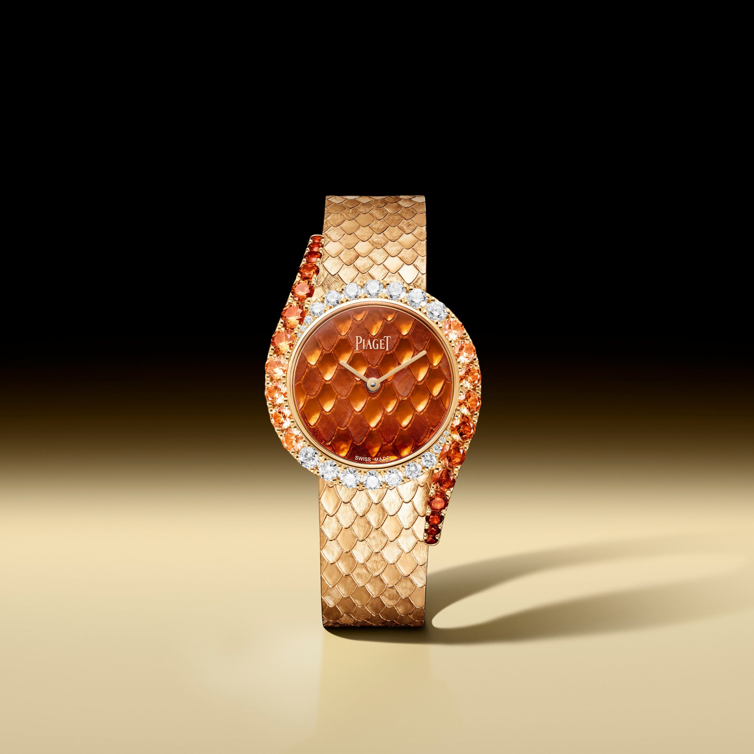 新作は、ケースやブレスレットにスネークパターンのゴールドエングレービング(彫金)を施し、文字盤には鮮やかなオレンジ色の「グラン・フ」エナメルを採用します。エナメルはガラス質の釉薬を焼き付ける装飾技法で、発色と耐久性が特徴です。