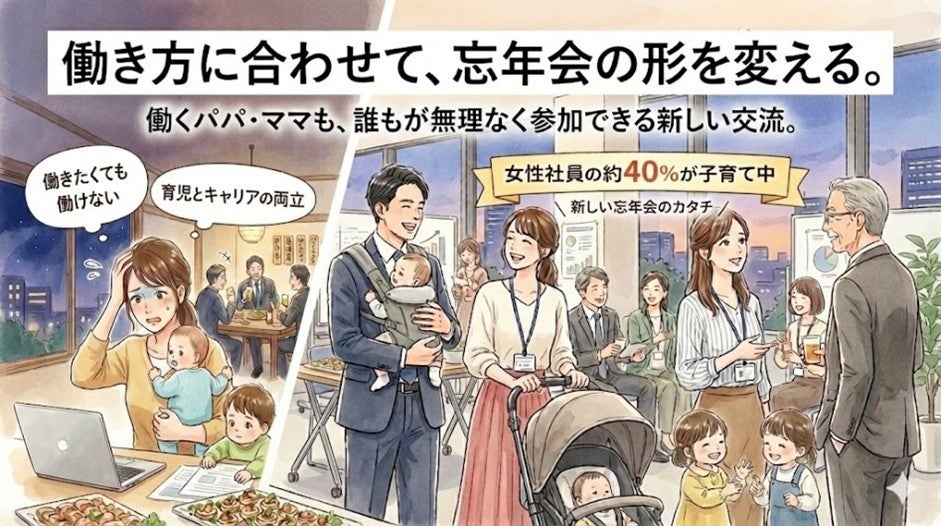 ピアズは2025年12月、子ども同伴で参加できるオフィス忘年会を実施しました。女性社員の約40%が子育て中という社内状況を踏まえ、夜間・社外開催で生じやすい参加障壁を下げる狙いです。当日はケータリング予約サイト「シェフコレ」を利用し、板前が目の前で握る出張寿司を導入しました。終業時間前後に参加しやすい時間設計とし、時短勤務後にそのまま参加する社員や、いったん子どもを迎えに行ってから合流する社員もいたといいます。寿司はマグロやサーモンなどの定番に加え旬の握りを提供し、子ども向け専用メニューも用意しました。オフィス内での開催により移動負担を抑えつつ、年末行事としての特別感も両立させた形です。今後は制度や運用面の工夫を重ね、ライフステージに左右されにくい働き方の整備を進める方針です。