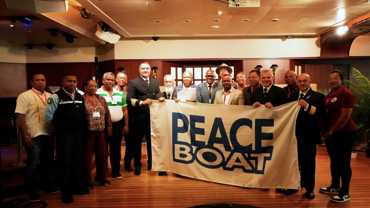 支援はピースボート地球一周の船旅「Voyage122」で船内保管していた物資を活用し、協働する旅行会社ジャパングレイスとともに実施しました。寄港時に訪船したアツィナナナ州知事ジャン・ジュギュ・ラザフィアリソン氏、国会議員ローラン・ラツィラカ氏らが立ち会い、引き渡し式を行いました。